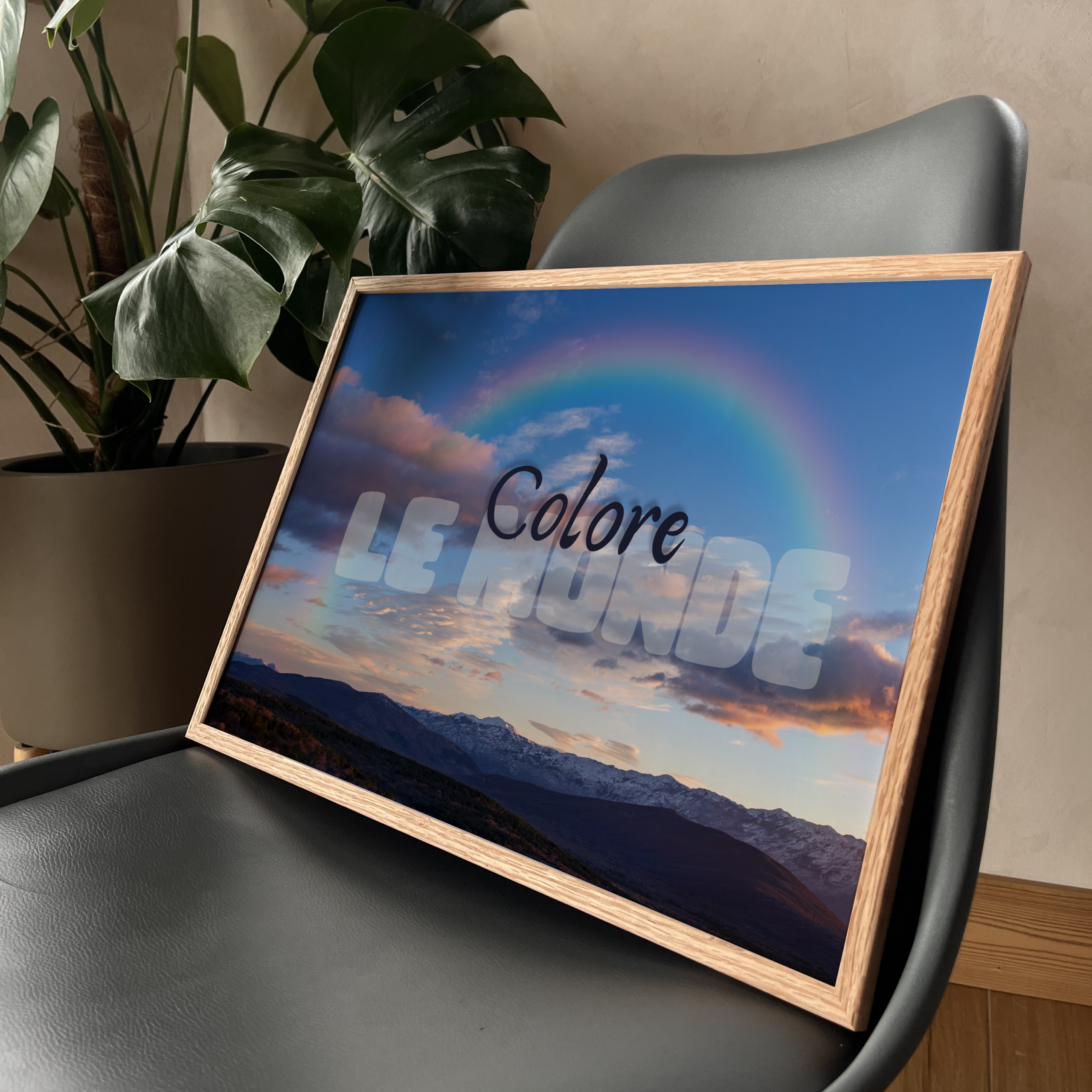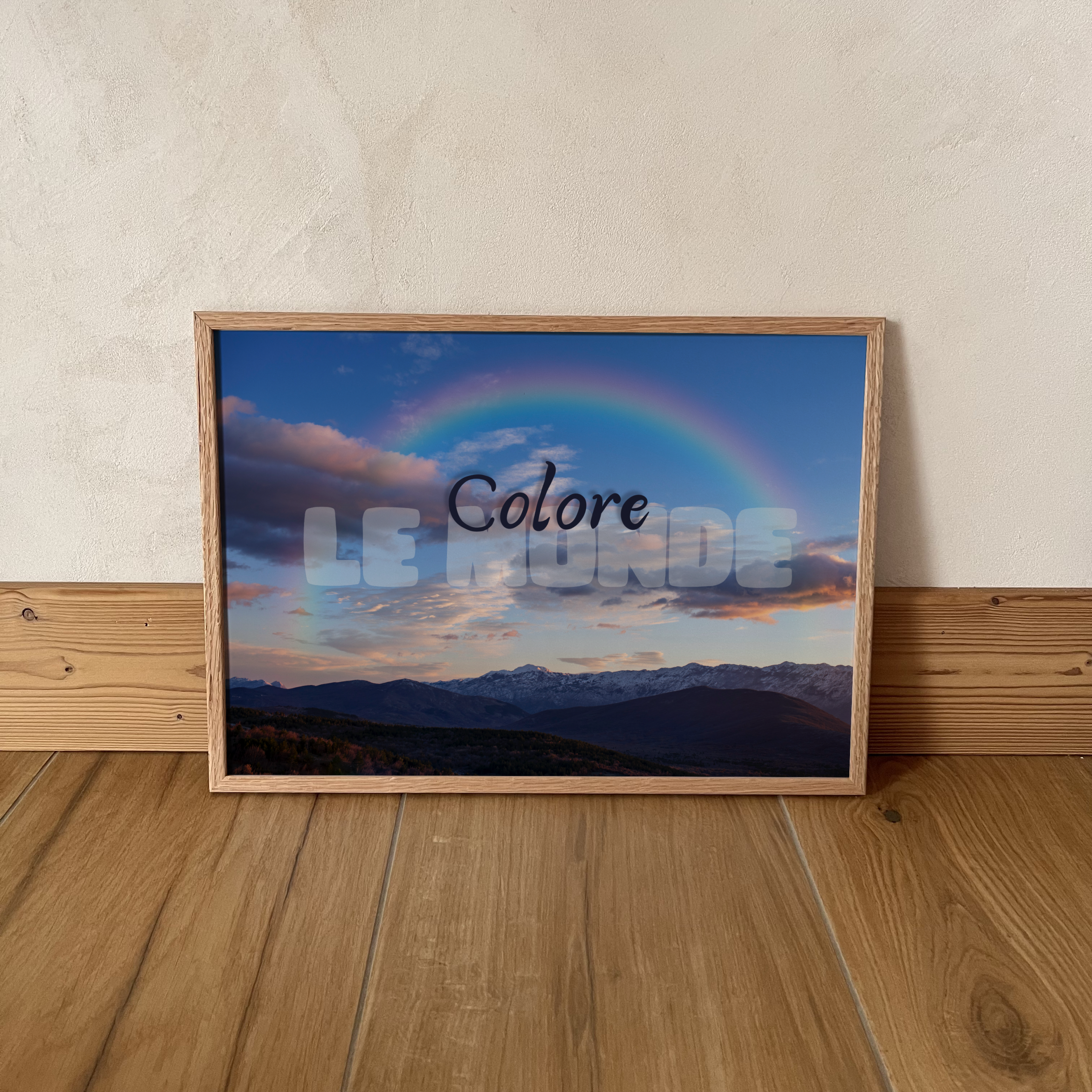 Le poster Colore le Monde capture un instant rare et précieux : un arc-en-ciel qui traverse le ciel au-dessus des montagnes, comme une invitation à voir le monde avec plus de douceur et de couleurs.