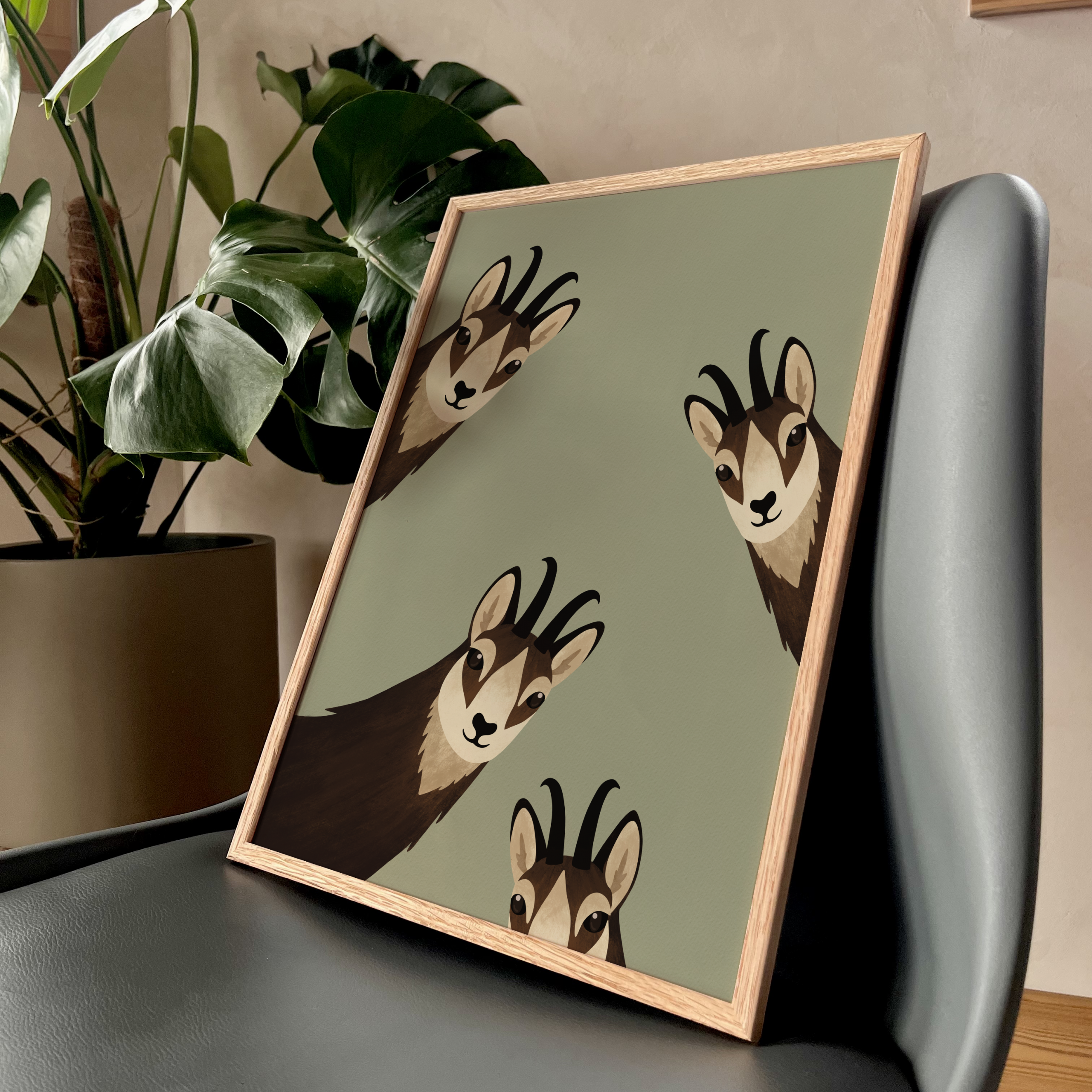 Le poster Les Quatre Chamois met en scène quatre chamois curieux qui semblent observer le spectateur.